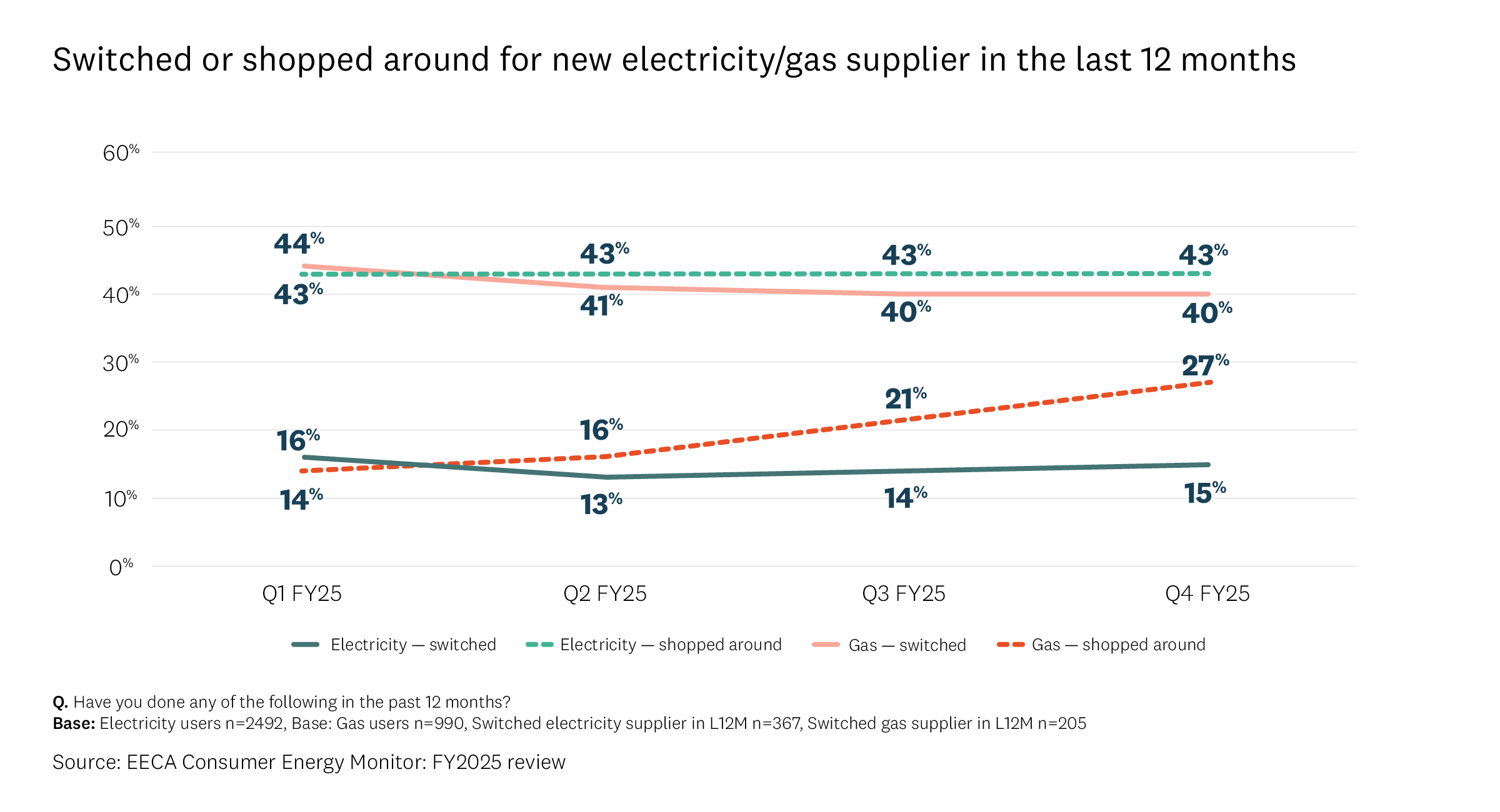Gas users were slightly more likely to switch suppliers, with 1 in 5 doing so in the past year. We saw a steep increase in gas supplier switching over the year, increasing from 14% in the first quarter (Q1 FY25) to 27% in the most recent quarter (Q4 FY25), equating to an over 90% increase in this behaviour.