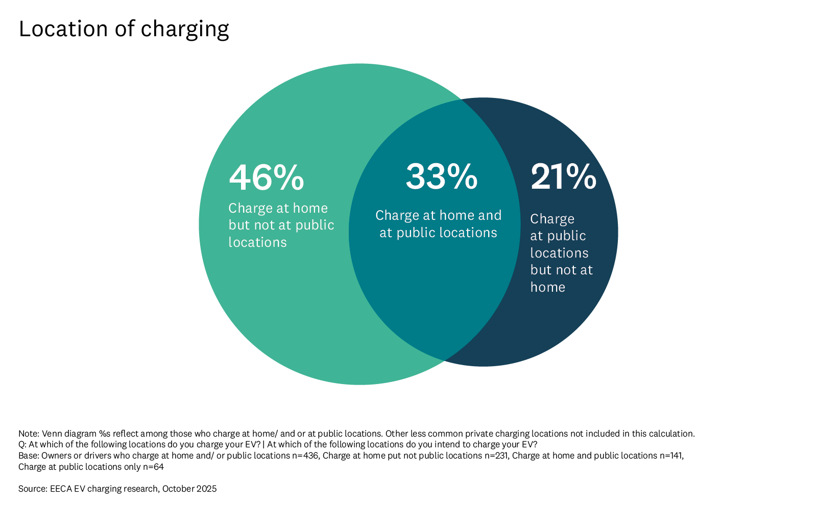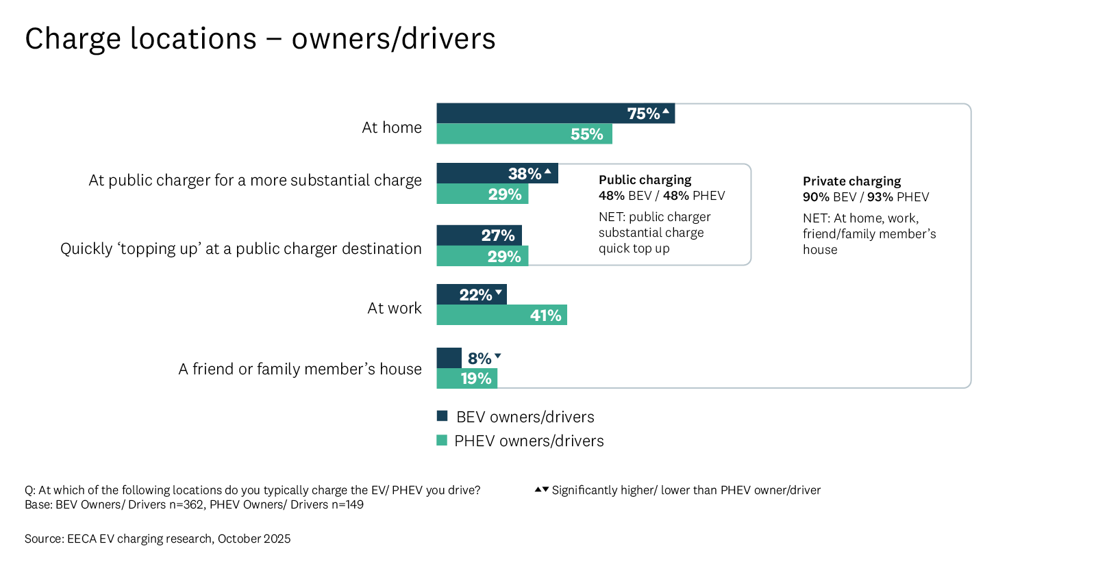 Overall, nearly half (46%) only charge at home, and do not use public charging. BEV drivers are significantly more likely to only charge at home (72%), compared to PHEV drivers (33%).
