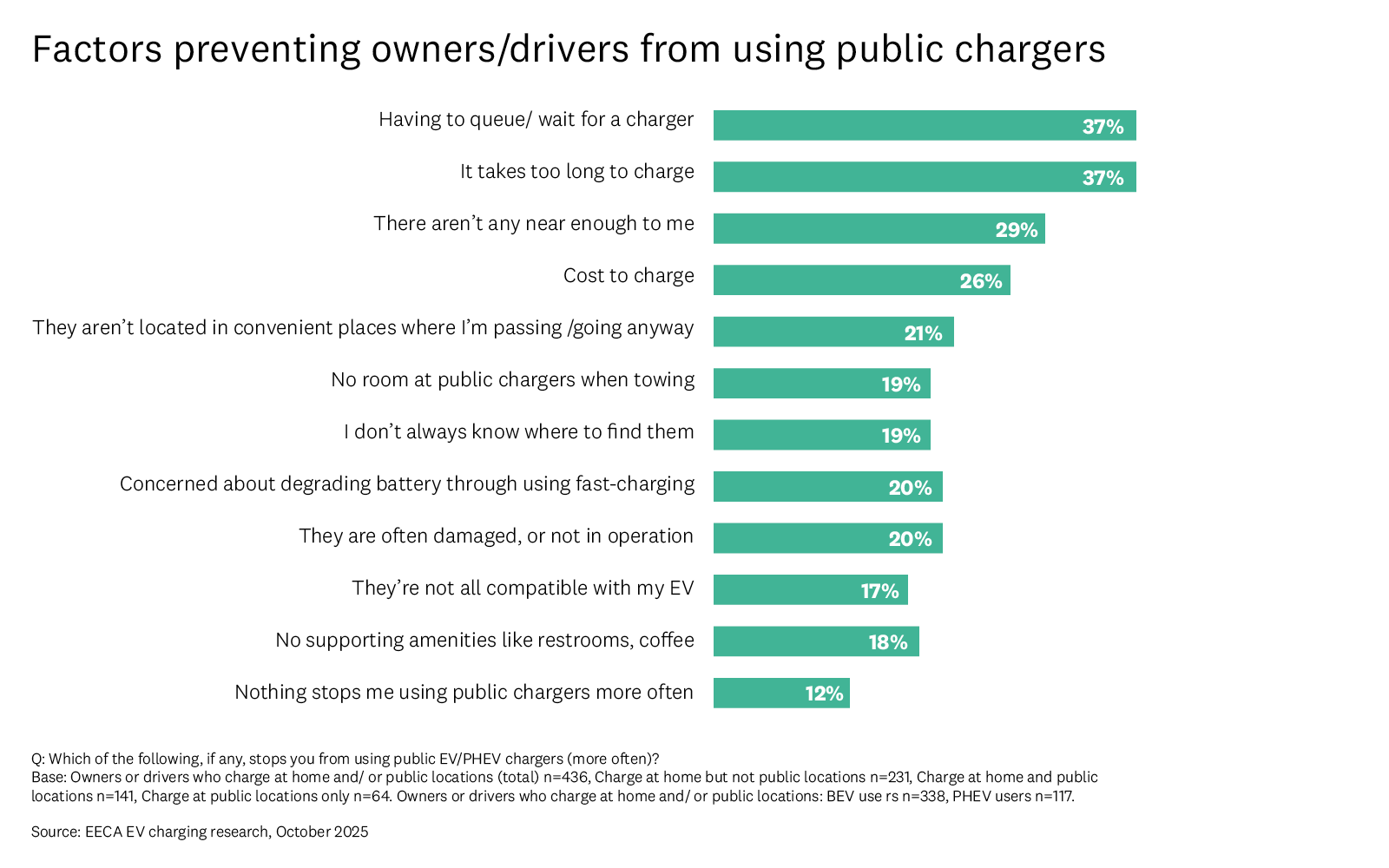BEV and PHEV drivers report that the biggest barrier to greater use of public chargers is inconvenience due to wait times, limited charging speeds and charger proximity.