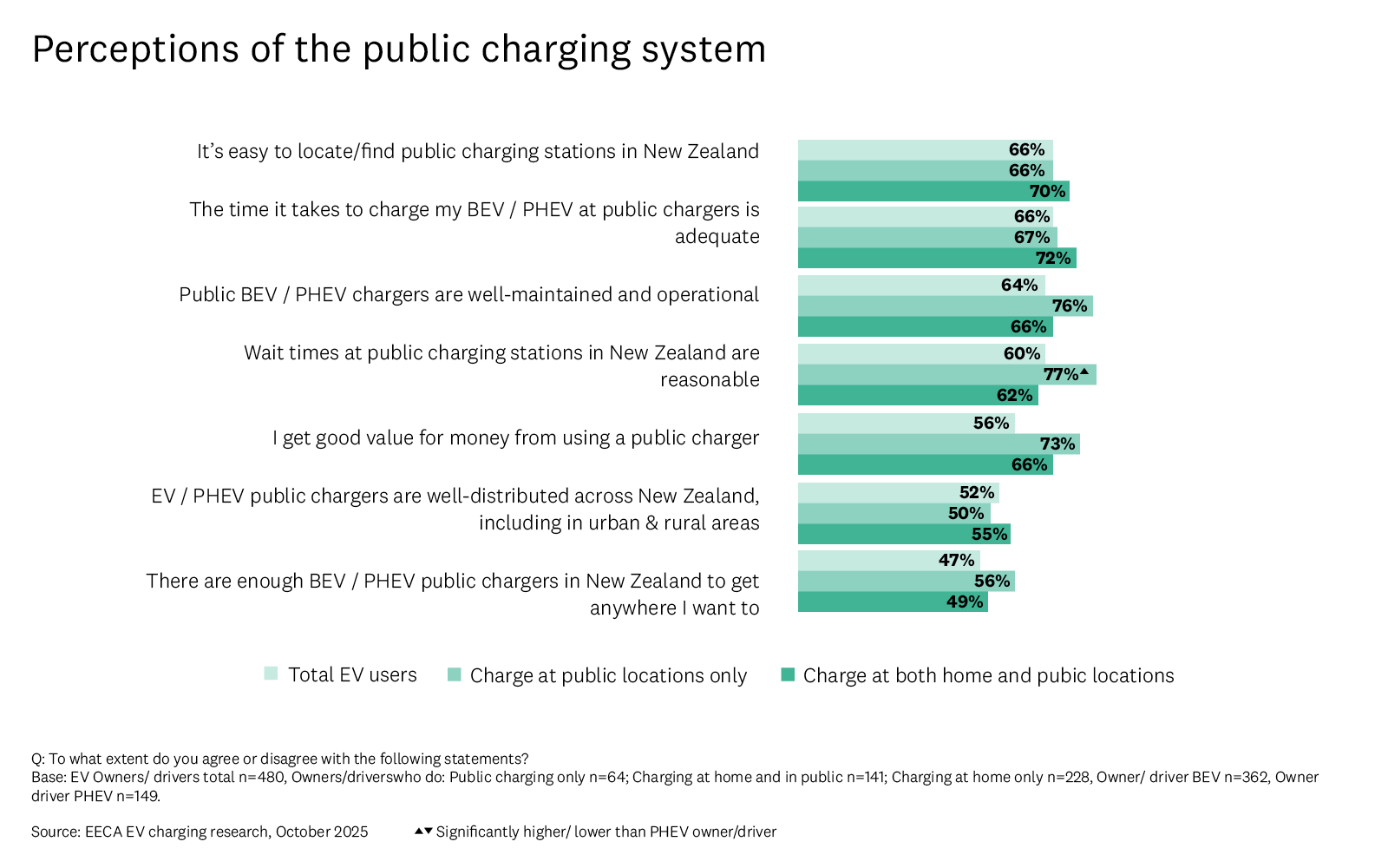 The perceived strengths of the charging network are different for those who only use public chargers and those who also charge at home. Over three quarters (77%) of those that only charge publicly report the wait times to be reasonable. A similar number of these drivers (76%) also view public chargers to be well maintained and operational, and good value for money (73%).