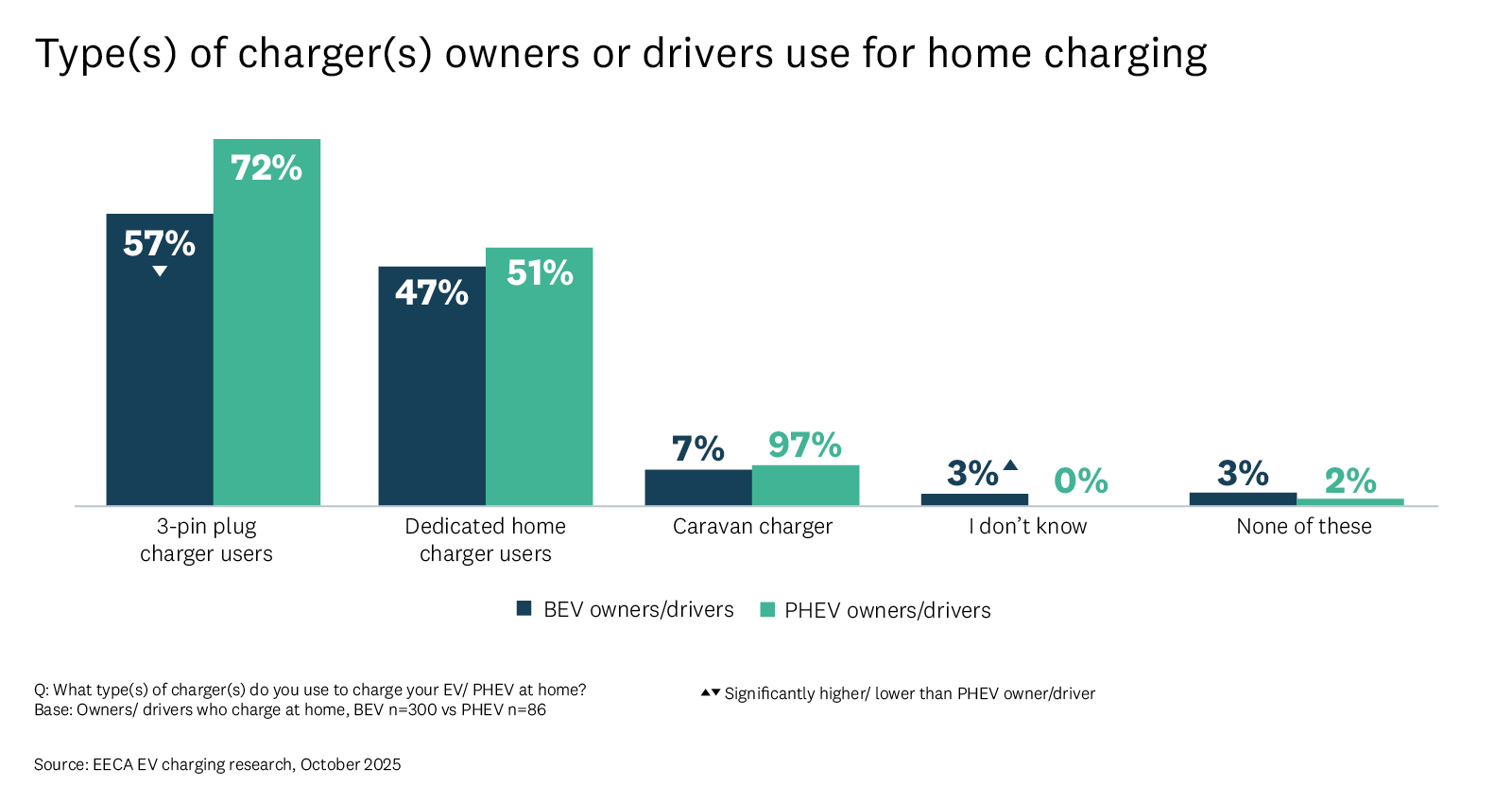 3-pin plug chargers remain the most widely used option, used by almost three quarters (72%) of PHEV owners/drivers and over half of BEV drivers (57%). There is a small increase in dedicated charger use — up 5% on 2024.