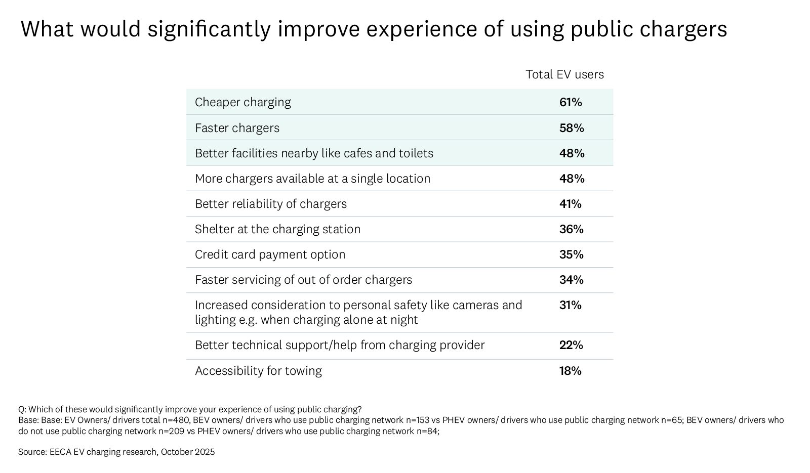 The top 3 improvements for public charging in New Zealand sought by EV and PHEV drivers are cheaper, faster, and better facilities nearby. Regionally, EV drivers from Auckland in particular desired cheaper charging (62%), drivers in Canterbury desired faster charging (80%) and those in the lower North Island, better facilities (84%).
