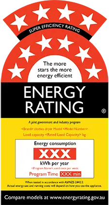 The Energy Rating Label shows how much energy a clothes dryers uses per year and provides a star rating that can be used to compare its energy efficiency with other clothes dryers.